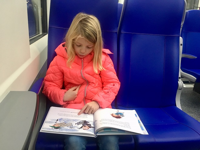 En welk eigenwijs kind wij bij ons hadden: wij gingen met de trein weer naar huis met onze enige echte eigen…Floddertje!