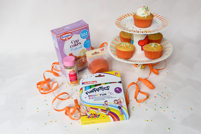 5) Heb je de cupcakes gebakken en versierd? Knutsel dan de etagère en kleur en knip de kaartjes bij je baksel. Print de betaalcode van jouw actie van de website, dan weet je zeker dat het opgeteld wordt bij jouw totaal!