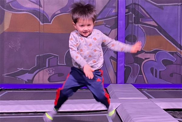 Bij MINIVROG spring je met een volwassene – Mama, papa (of Oma/Opa!) en met toezicht van een trainer.