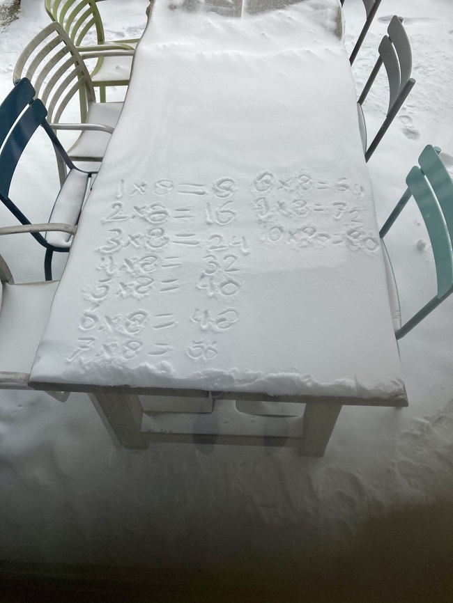 12. Is de school nog dicht? Dan maak je de tafels toch gewoon in de sneeuw!