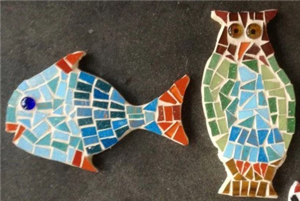 Vanaf 7 jaar kun je mozaïeken op een houten dierenfiguur of spiegel met geknipte glasmozaïek en tegelstukjes.
