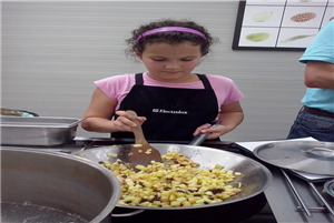 De kids maken onder begeleiding van de kok een volledig menu klaar.