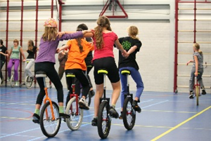 Bij Circuskunst leer je veel verschillende onderdelen van het circus. Jongleren, diabolo, bordjes draaien maar ook éénwielfietsen en acrobatiek horen erbij. En als echte acrobaat hang je natuurlijk ook in de trapeze.