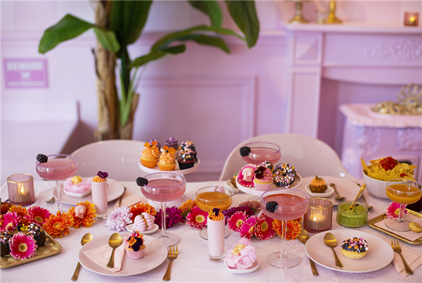 Dit arrangement bevat ook kannen limonade op tafel en twee mini cupcakes per persoon om ondertussen te kunnen snoepen.