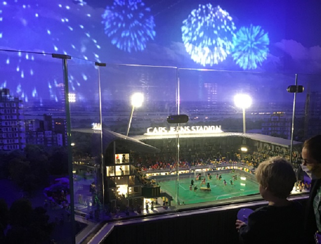 Miniland is zeker niet alleen kijken (wat al helemaal tof is, want je ziet steeds weer nieuwe details). Je kunt ook dingen doen. Bijvoorbeeld een goal proberen te maken in het Cars Jeans stadion van ADO! Mét spectaculair vuurwerk!