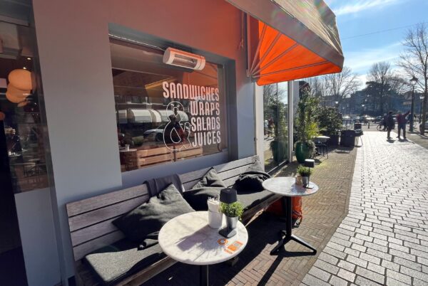 Sandwiches, wraps, salades en juices. Lekker bankje met kussens voor de deur en binnen kinderstoelen, wat speelgoed en een kleurplaat. Do we need to say more? Ja, misschien dat het vlakbij de speeltuin is!
