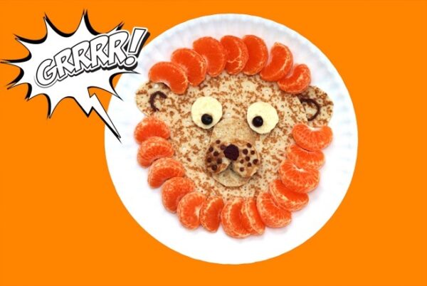 Voor het maken van een leeuw heb je nodig: een pannenkoek, een stukje pannenkoek voor de neus, poffertjes voor de oren en een poffertje voor op de neus met een braam en stipjes van Nutella. Voor de ogen heb je twee schijfjes banaan nodig met twee bosbessen. De manen van de leeuw maak je met stukjes mandarijn.