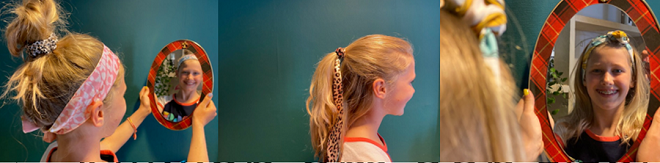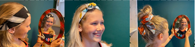 Voor meiden met lange haren is het leuk om de onderlaag los te laten hangen en de bovenkant vast te zetten met een knot. SUPERTIP: alle losse fijne haartjes werk je makkelijk naar achter met een wenkbrauwgel (verkrijgbaar van bv Essence bij het Kruidvat). Wat ook erg leuk is…een haarband met ijzerdraad erin Deze link opent in een nieuwe tab! Je kunt hem voor van alles gebruiken. Via Angela’s webshop Choices by Ann Deze link opent in een nieuwe tab kan je ze voor € 6,95 bestellen. Je draait de haarband om een knot. Je knoopt ‘m vast aan de bovenkant of aan achterkant. Kortom, een leuke haarband met veel mogelijkheden! En zoals bij alles; oefening baart kunst!
