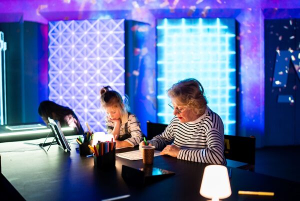 Je wordt verwelkomt aan de verjaardagstafel in de lounge. Na een kort welkomstwoordje kunnen de kinderen samen met hun begeleider op ontdekking gaan in de experience. Zo kunnen ze een kleurplaat tekenen, inscannen en tot leven laten komen in projectie. Lekker in de ballenbak, of deelnemen aan een levensgroot spel in de immersive experience.