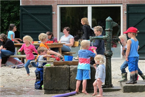 Klieder lekker met zand, waterpomp en waterspeelmodel, buiten bij het bezoekerscentrum. Er is ook een speeltuin en ruim plek om te picknicken.