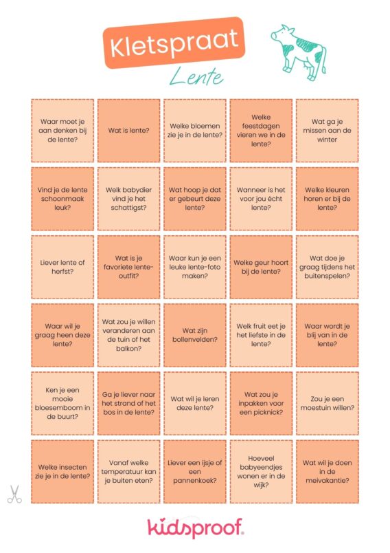 Welke bloemen zie je in de lente? En vanaf welke temperatuur kan je buiten eten? Deze en meer leuke vragen over de lente vind je in de Kidsproof Kletspraat Lente editie.