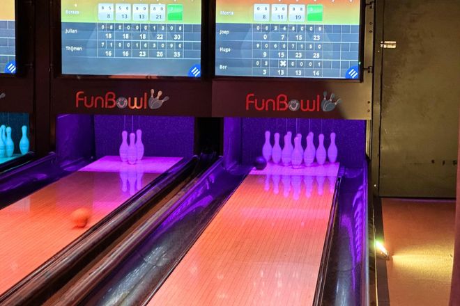 Het fun bowlen Deze link opent in een nieuwe tab was voor ons helemaal nieuw! Je meld de deelnemers aan op een beeldscherm. We hebben twee banen, dus we verdelen de groep in tweeen. Fijn, want daardoor ben je als speler steeds lekker snel aan de beurt! Het spreekt allemaal erg voor zich, dus de mannen start snel. Fun Bowlen is net even anders dan het traditionele bowlen. Er verschijnen kleinere, soort van kogels ipv de traditionele ballen waarmee je makkelijk en snel kunt gooien.