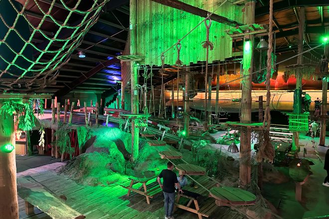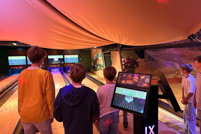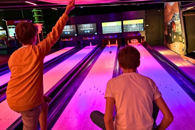 In Huizen aangekomen, worden we welkom geheten en mogen we doorlopen naar achter. We lopen over de loopbrug boven de kartbaan helemaal door naar achter. Langs het klimpark Deze link opent in een nieuwe tab, tot we aangekomen zijn bij de baan waar de mannen mogen beginnen met fun bowlen Deze link opent in een nieuwe tab.