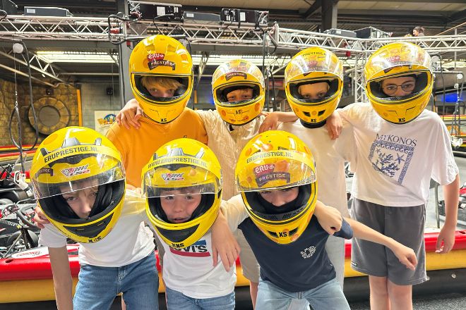 De instructeur loopt per persoon de kart na. Hij checkt of je helm goed zit, je stoel goed staat, of je riem goed vast zit en of de jongens allemaal goed bij hun pedalen kunnen. De spanning op de gezichten neemt toe!