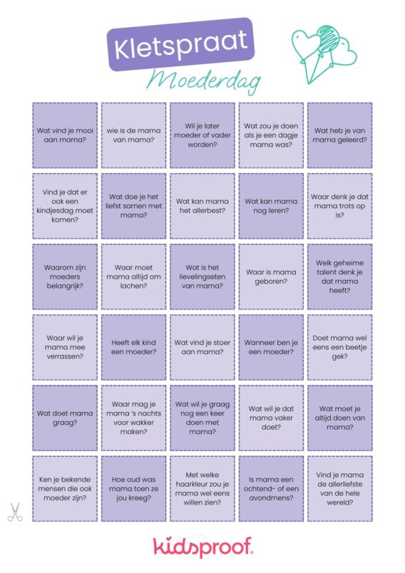 Wat zou je doen als je een dagje mama was? En waarom zijn moeders zo belangrijk? In de Kidsproof Kletspraat Moederdag vind je een heleboel leuke kletsvragen om aan je kinderen te stellen. Download de vragen hier gratis.
