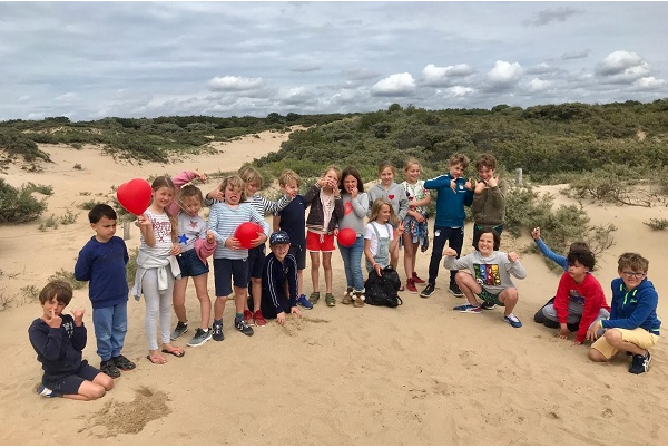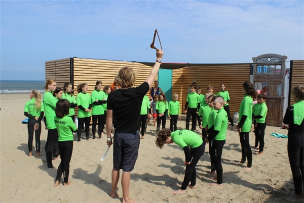 De instructeur gaat samen met de groep kids in het duin naast Beach Break dit gave spel spelen.