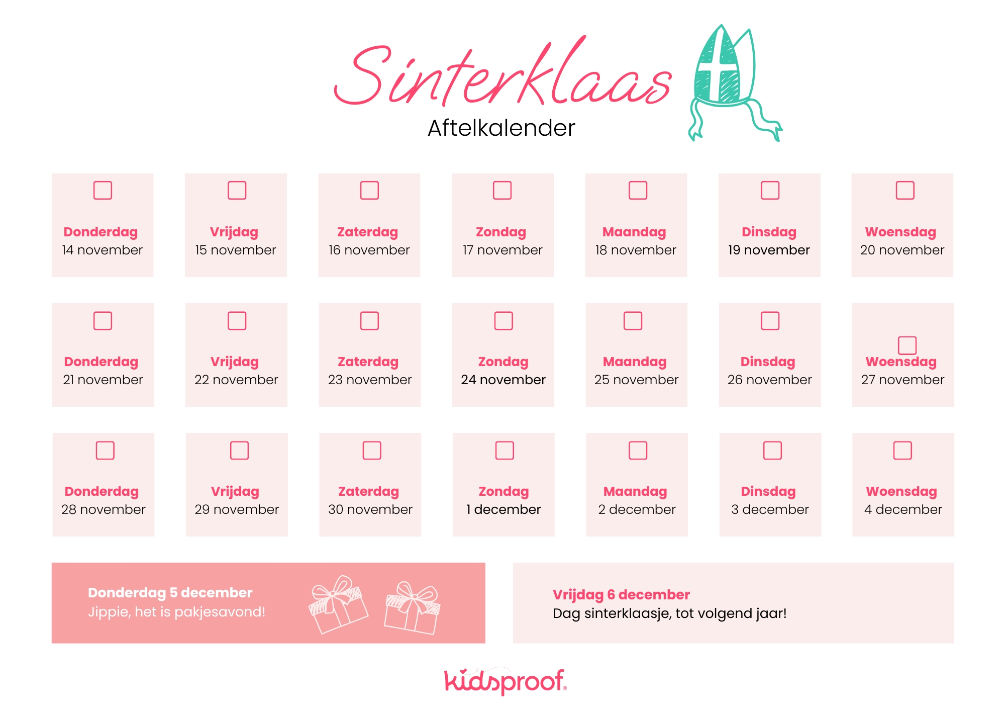 Print daarom deze gave Kidsproof aftelkalender waarop de kinderen elke ochtend een vakje kunnen afkruisen tot Sinterklaas. Op deze leuke manier is het duidelijk voor de kinderen hoeveel nachtjes het nog slapen is tot het heerlijk avondje is gekomen!