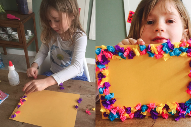 Houd jij van knutselen met papier? Dan heb je dit mooie lijstje zo gemaakt. Scheur vrolijk gekleurd papier (niet te dik papier, crêpepapier of vliegerpapier is ideaal) in kleine stukjes. Maak van die stukjes een propje en plak ze op een vrolijk en stevig blaadje. En hoppa, je lijstje is klaar!