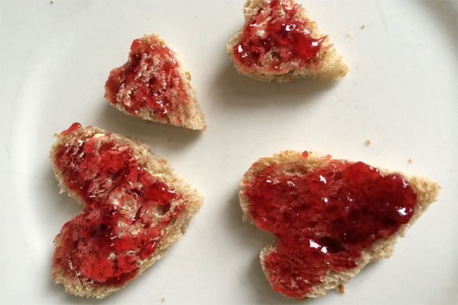 Een leuk begin van moederdag. Naast een lekker kopje thee zal je moeder vast heel blij worden van deze hartjesboterhammen met jam!