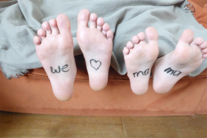 Simpel maar zo lief! Schrijf een leuk tekstje onder je voeten. Voetjes onder het dekbed, mama oogjes dicht en dan, tadaaa!