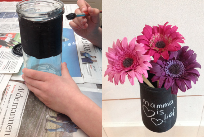 Een leuke knutseltip is deze mooie vaas. Verf een jampotje met schoolbordverf, laat het even drogen, schrijf er iets liefs op et voila!