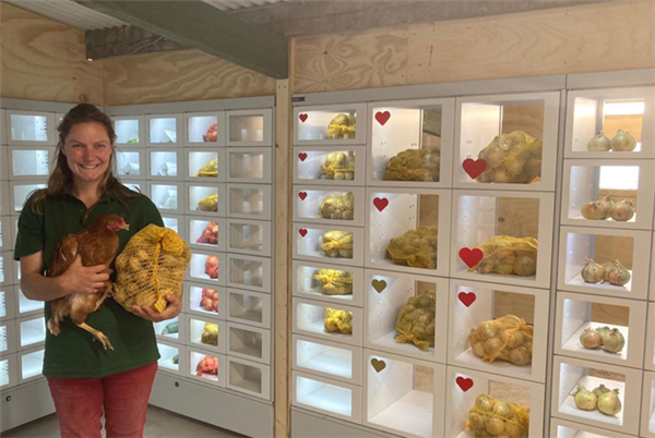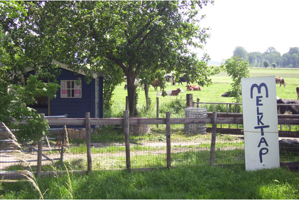 Langs de kant van de weg staat een melktap en eieren- en vriesautomaat: een soort mini boerderij winkeltje met melk, eieren en vlees vers van de boerderij die 7 dagen per week, 24 uur per dag open is.