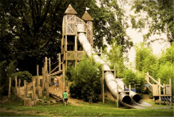 Een unieke, grote speeltuin tussen de bomen. Het lijkt net alsof je in het bos aan het spelen bent!